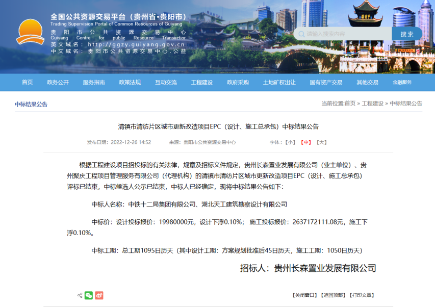 2022年12月26日,貴陽市公共資源交易中心網(wǎng)站發(fā)布清鎮(zhèn)市清紡片區(qū)城市更新改造項目EPC(設(shè)計、施工總承包)中標(biāo)結(jié)果公告,湖北天工建筑勘察設(shè)計有限公司聯(lián)合中鐵十二局集團(tuán)有限公司中標(biāo)26億城市更新改造EPC項目,其中設(shè)計費(fèi)1998萬,中標(biāo)總工期1095天,設(shè)計工期為方案規(guī)劃批準(zhǔn)后45天,施工工期1050天。