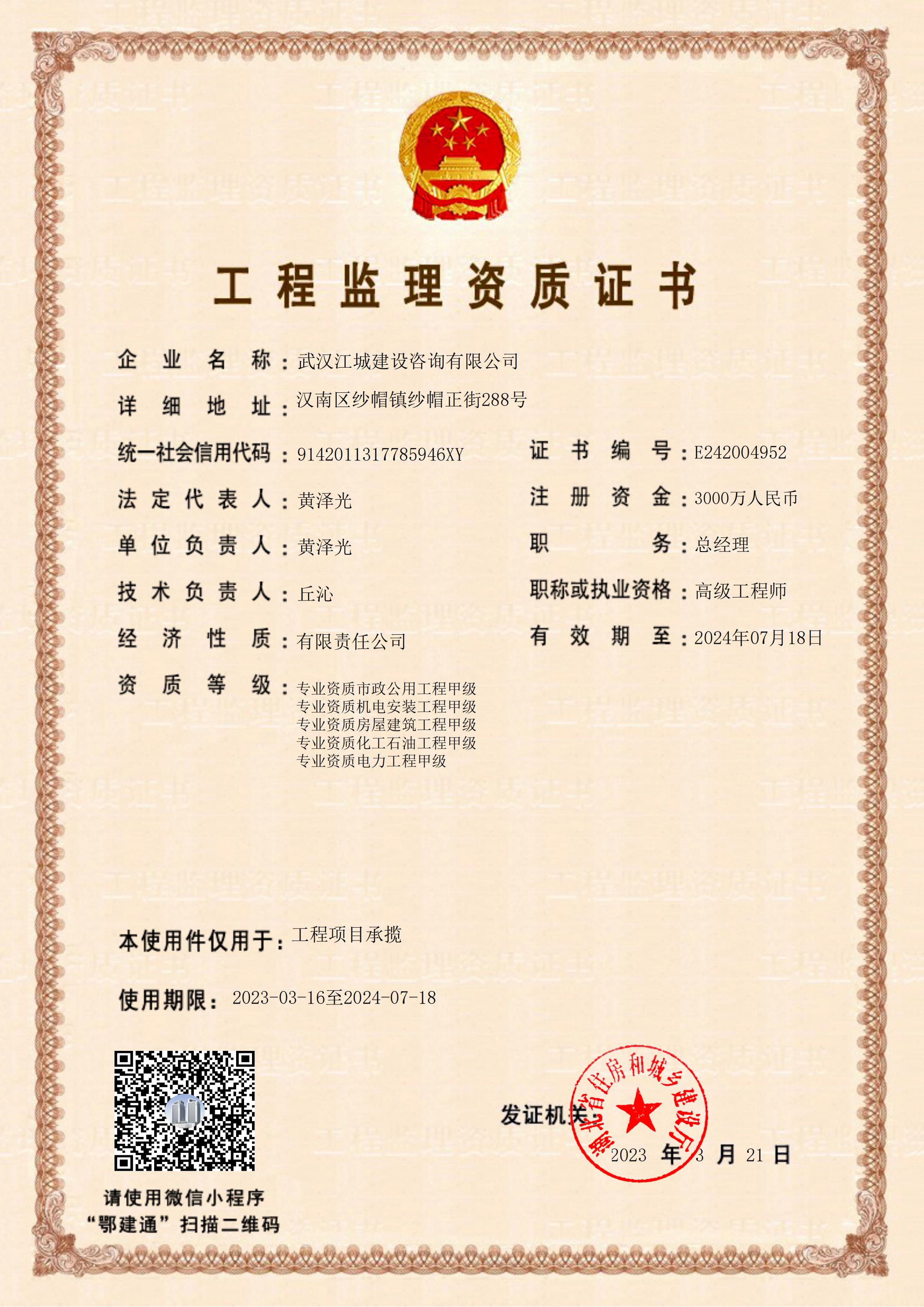 2023年3月17日,湖北省住房和城鄉(xiāng)建設廳公布了核準的工程監(jiān)理企業(yè)資質(zhì)——武漢江城建設咨詢有限公司(以下簡稱“武漢江城”)獲電力、化工石油專業(yè)甲級資質(zhì),形成了具備房建、市政、機電、電力、化工石油五項甲級資質(zhì)的“新江城”。“新江城”將以踔厲奮發(fā)、篤行不怠的姿態(tài)勇毅前行,力行盡快申請到綜合級監(jiān)理資質(zhì),屆時武漢江城將會以監(jiān)理為契機,重組相關設計資質(zhì),努力為開拓發(fā)展全過程工程咨詢服務創(chuàng)造條件。